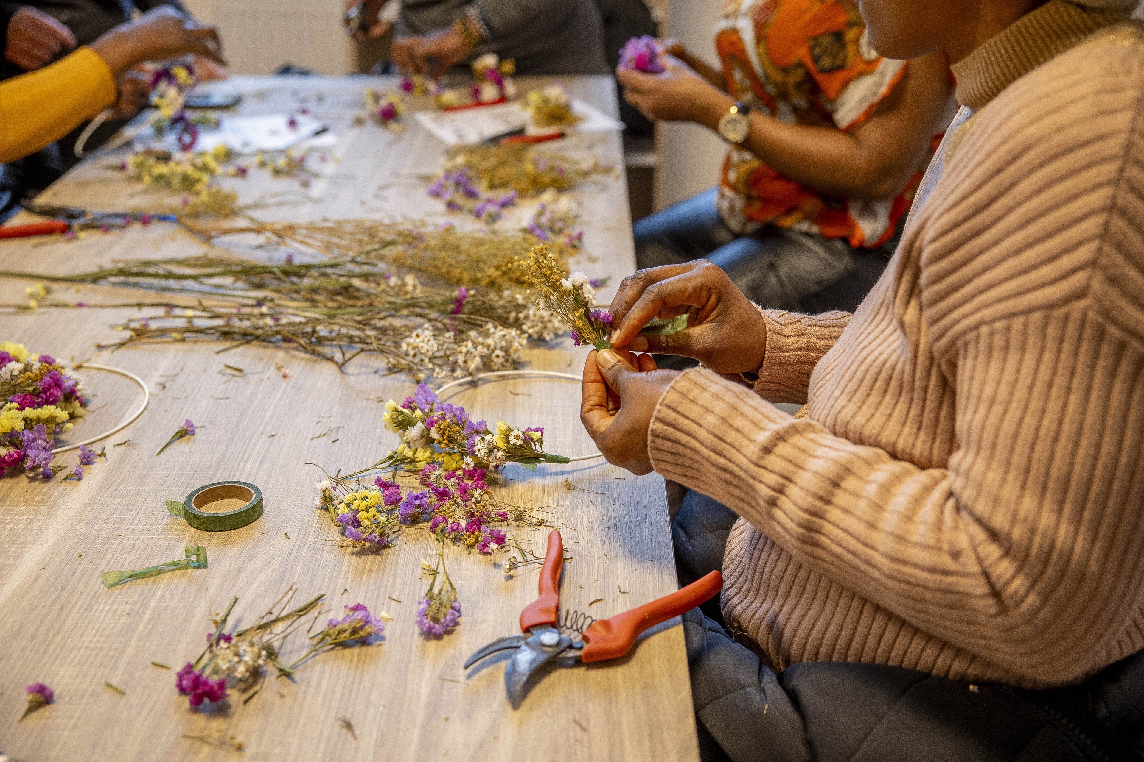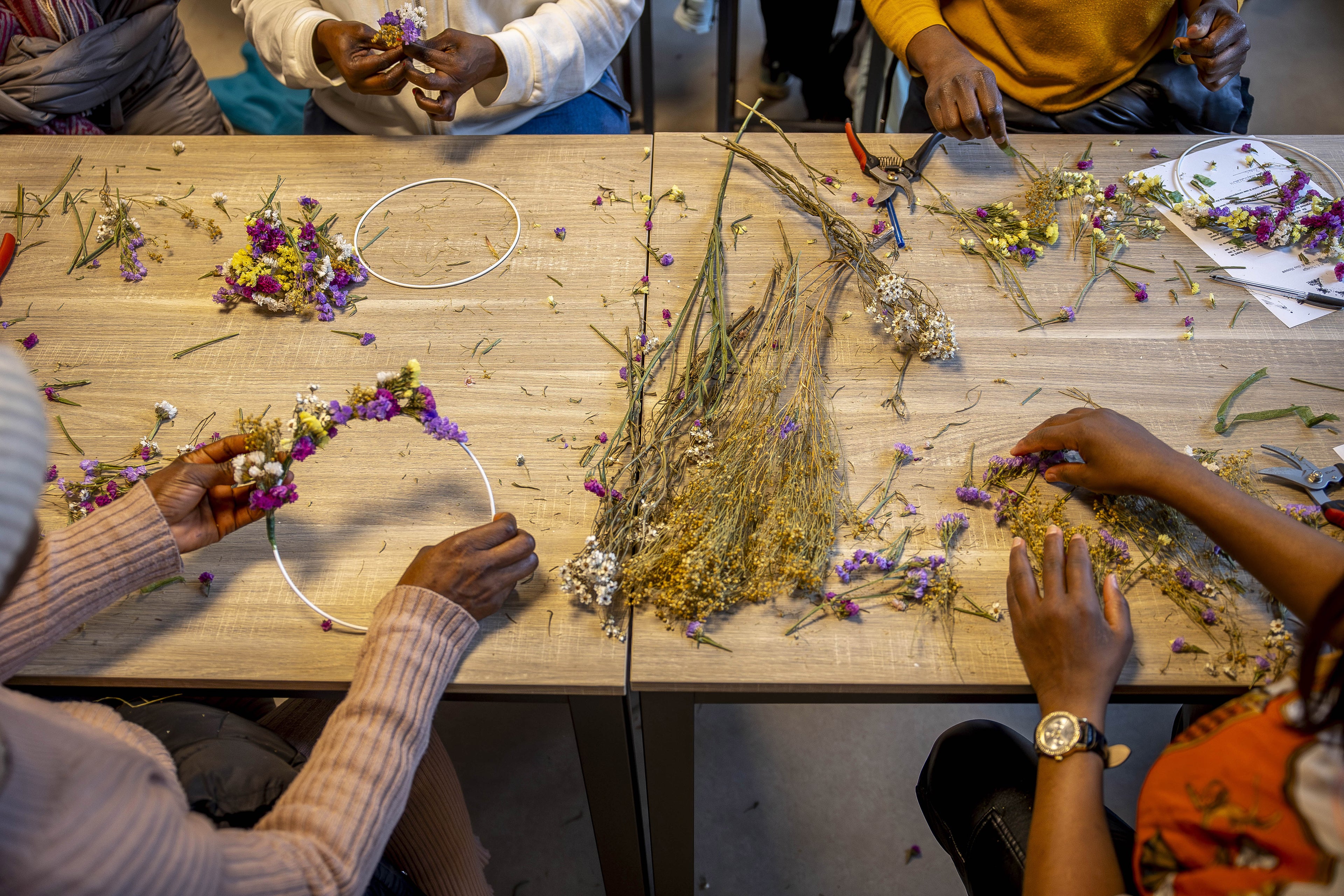 Ces ateliers sont aussi l’occasion de présenter le métier de fleuriste et de déclencher une vocation avec la perspective d’une reconversion rendue possible par notre formation d’assistante fleuriste. Les ateliers sont animés par d’anciennes participantes de la formation qui viennent transmettre leurs connaissances et témoignent de leur expérience au sein de l’association.